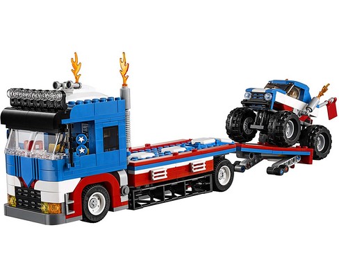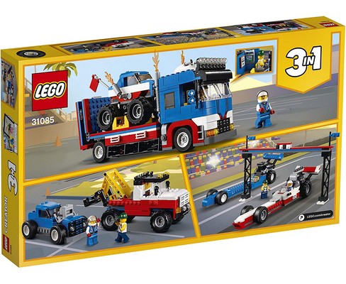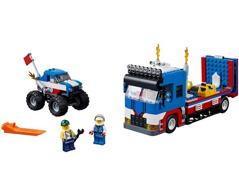 Contiene un trasportatore a pianale con rampe per acrobazie apribili, più un monster truck e una torre di faretti Posiziona i fari, blocca le ruote del trasportatore e abbassa le rampe apribili, quindi accendi il monster truck e raggiungi la rampa a tutta velocità per un atterraggio ottimo