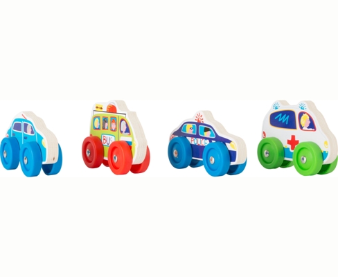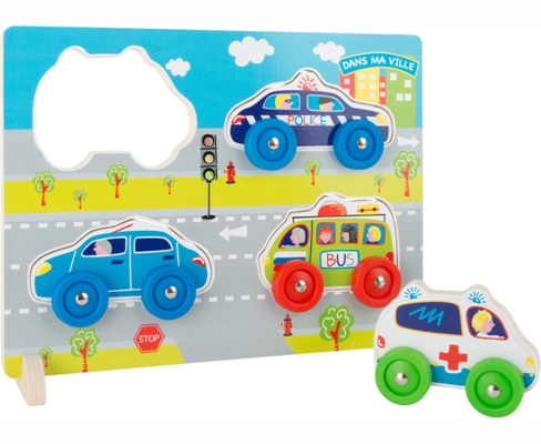 Un puzzle ad incastro con 4 veicoli dotati di ruote che possono essere usati anche per giocare.