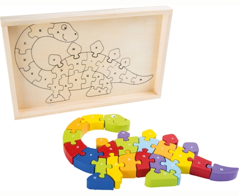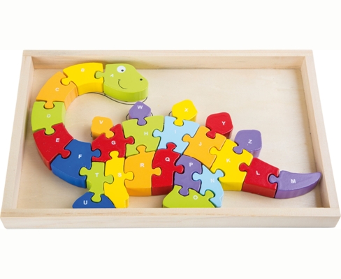 Puzzle da 26 pezzi per imparare le lettere dell'alfabeto. Il disegno sul fondo della scatola facilita il corretto posizionamento dei pezzi.