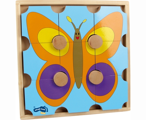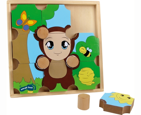 Con questo puzzle in legno da 9 pezzi si crea il disegno di una farfalla su un lato e di un orso sull'altro lato.