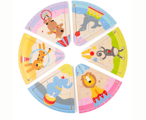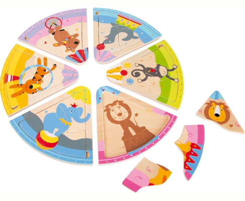 Puzzle circolare con 6 diversi animali del circo. Il disegno sulla base della tavoletta facilita il riconoscimento dei pezzi da inserire.
