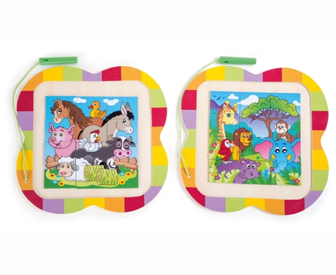 2 puzzle da 12 pezzi con cornice: animali della fattoria e animali selvaggi. Le tessere del puzzle si possono sollevare con una penna magnetica per essere poi posizionate al posto giusto.