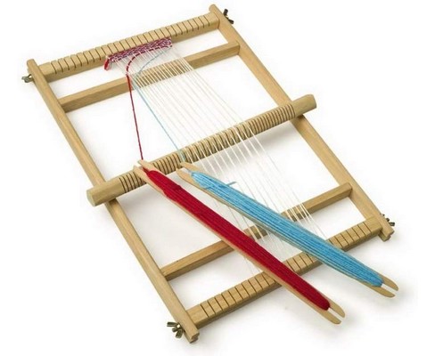 Telaio in legno per i primi lavoretti di tessitura, con 2 spolette. Dimensioni: 45x32x2cm